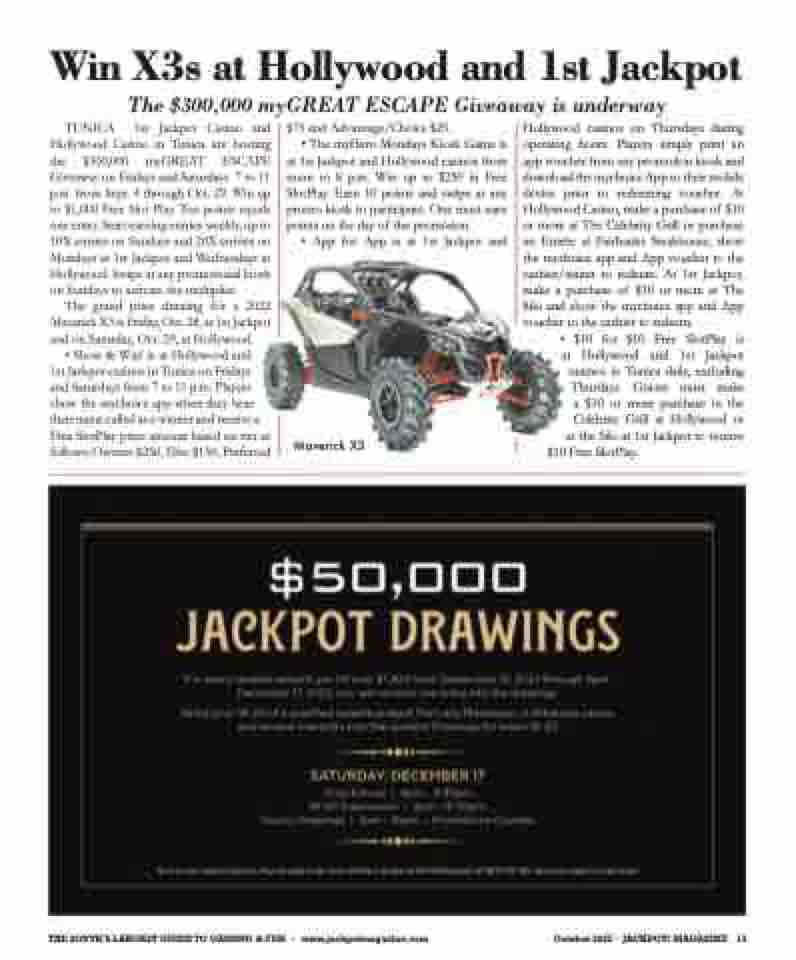 The grand prize drawing for a 2022 Maverick X3 is Friday, Oct. 28, at 1st Jackpot and on Saturday, Oct. 29, at Hollywood.