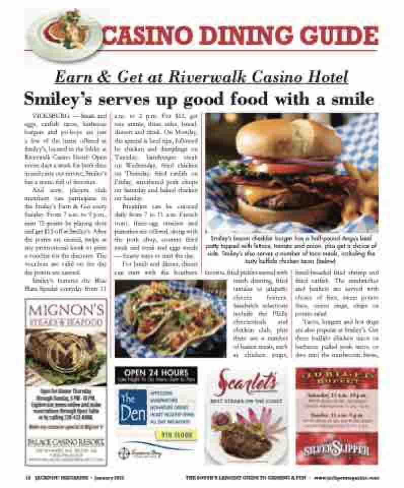 VICKSBURG — Steak and eggs, catfish tacos, barbecue burgers and po-boys are just a few of the items offered at Smiley’s, located in the lobby at Riverwalk Casino Hotel. Open seven days a week for both dine in and carry out service, Smiley’s has a menu full of favorites.