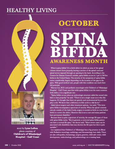 Marcus Lee, M.D. and pediatric neurologist with Children’s of Mississippi Hospital – Gulf Coast, says that while spina bifida is not the most common birth defect, it is a significant one.