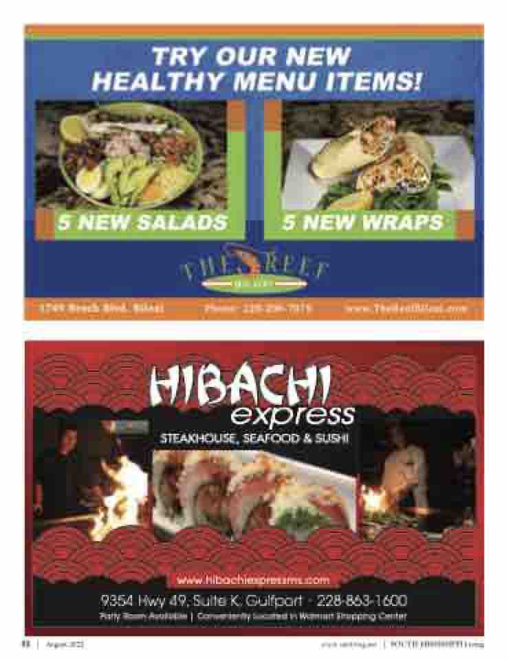 HIBACHI express STEAKHOUSE, SEAFOOD & SUSHI www.hibachiexpressms.com 9354 Hwy 49, Suite K, Gulfport • 228-863-1600 Party Room Available | Conveniently Located in Walmart Shopping Center 32 | August 2022 www.smliving.net | SOUTH MISSISSIPPI Living